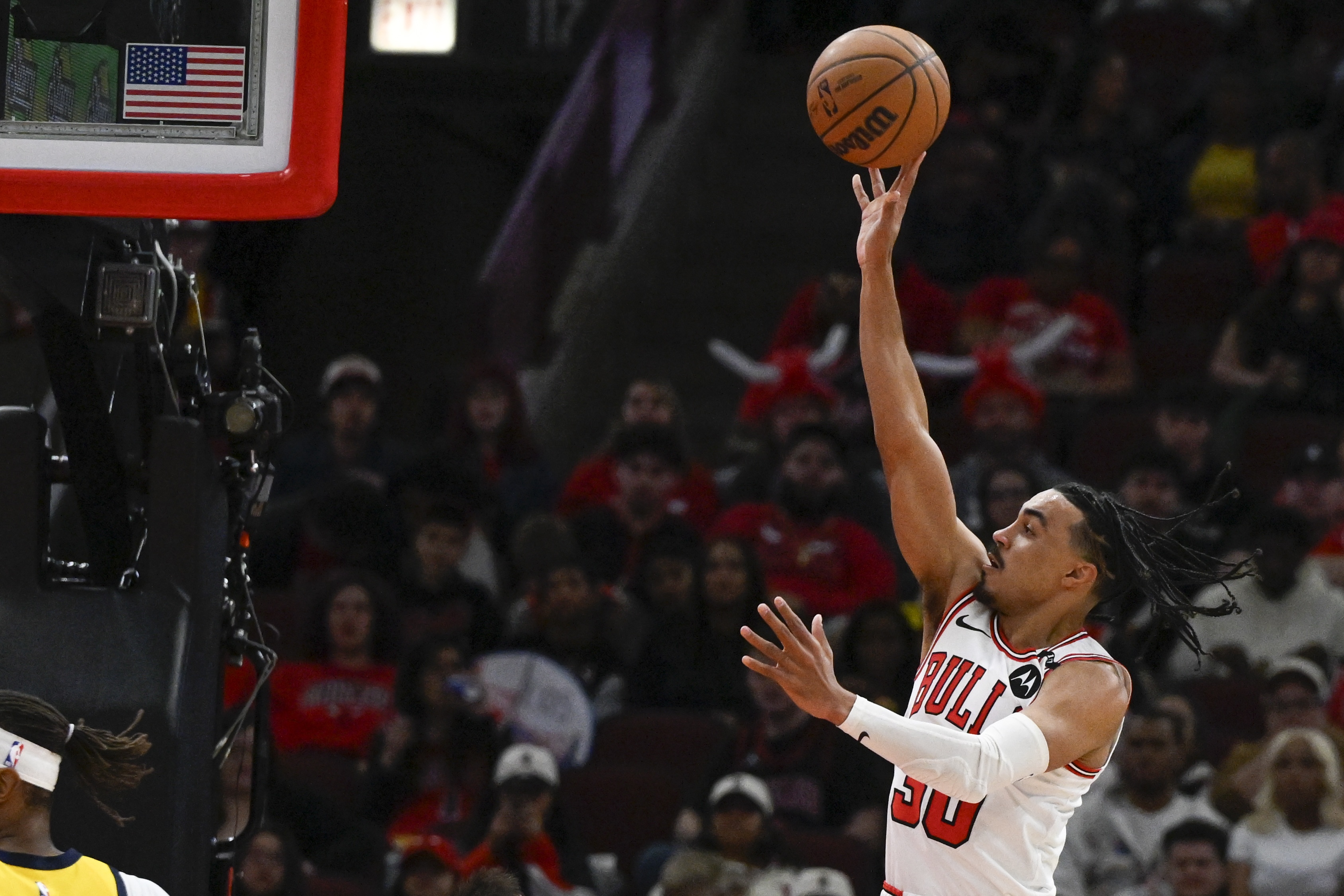 上半場比賽,公牛后衛(wèi)特雷-瓊斯發(fā)揮十分不錯,進(jìn)攻端里突外投很高效,且能串聯(lián)球隊(duì),他6中5,三分1中1,罰球2中1砍下12分1籃板5助攻。