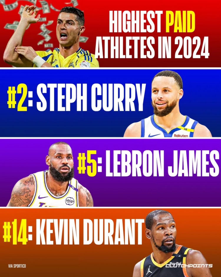 3月10日訊 美媒《Sportico》公布2024年年收入最高的運(yùn)動(dòng)員排行,其中,庫里第二僅次于C羅,詹姆斯第五,詳情如下: