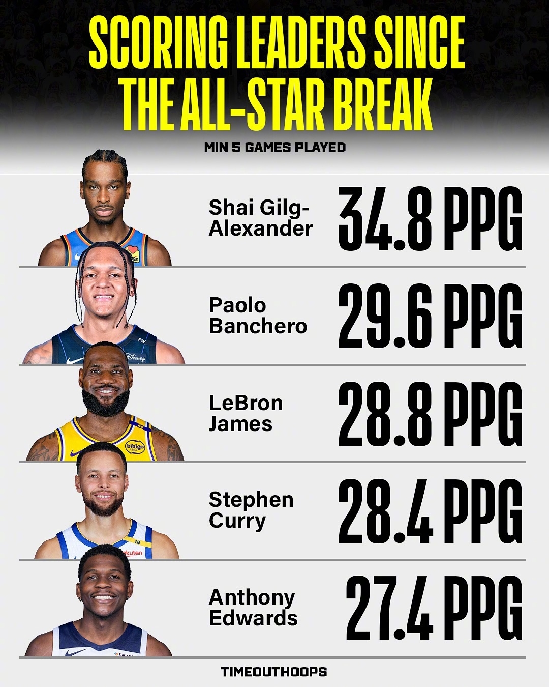 全明星后得分榜:鴨梨34.8分?jǐn)鄼n第一 班凱羅第二 詹庫分列三四位?