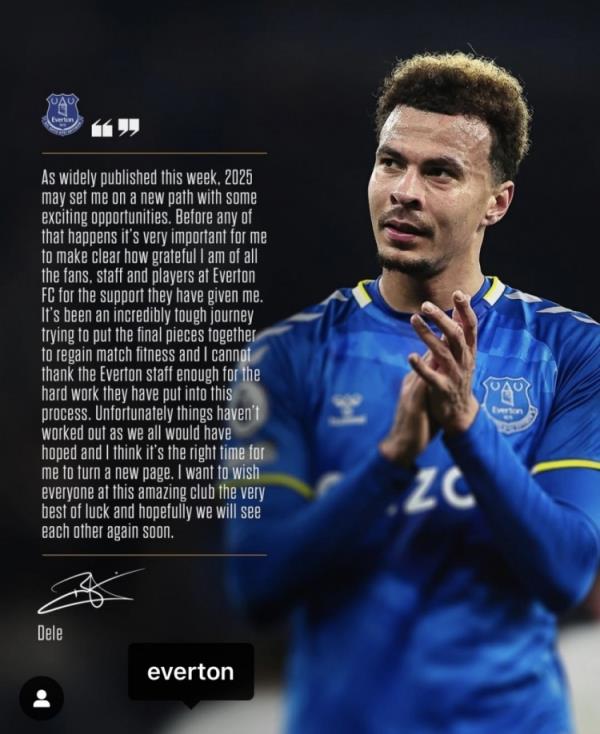 阿里寫道:“正如本周大家廣泛談?wù)摰哪菢樱?025年我可能會走上一條新的道路,因為有一些令人感到興奮的的機會。在這一切發(fā)生之前,我必須要先明確的表達一下我對于所有球迷的感激之情,以及埃弗頓所有工作人員以及球員對我的支持。