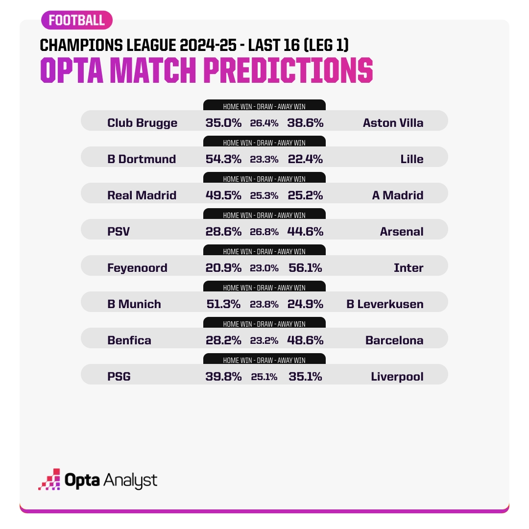 Opta預測歐冠16強賽首回合勝率: