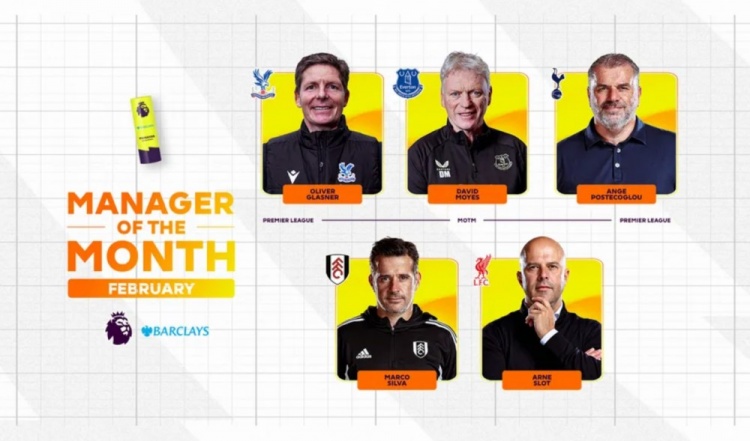 3月6日訊 英超官方公布2月最佳教練候選,格拉斯納、莫耶斯、波斯特科格魯、馬爾科-席爾瓦、斯洛特5名教練獲提名。