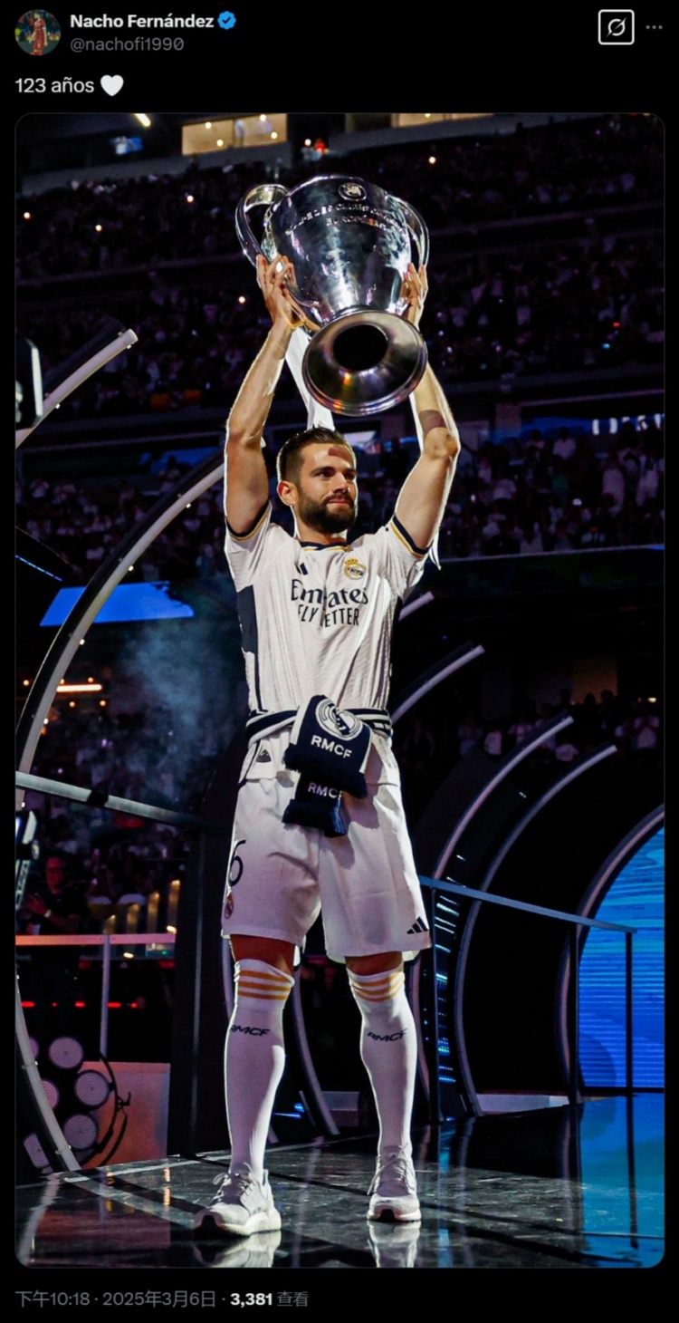 今天是皇家馬德里足球俱樂部建立123周年的日子,納喬在個人社媒曬出他高舉歐冠獎杯的照片為皇馬慶生,他同時配文:123歲。