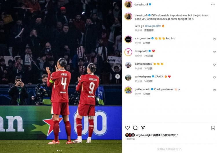 賽后努涅斯在個人社媒曬出與范迪克謝場照片,配文寫道:“艱難的比賽,重要的勝利,但是工作還沒有完成,主場還有90分鐘比賽需要拼搏?!?/p>