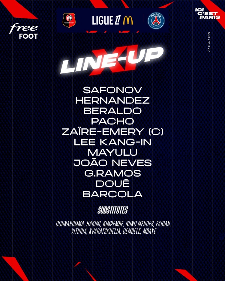 替補:1-多納魯馬、3-金彭貝、2-阿什拉夫、25-門德斯、17-維蒂尼亞、8-法比安、49-姆巴耶、10-登貝萊、7-克瓦拉茨赫利亞