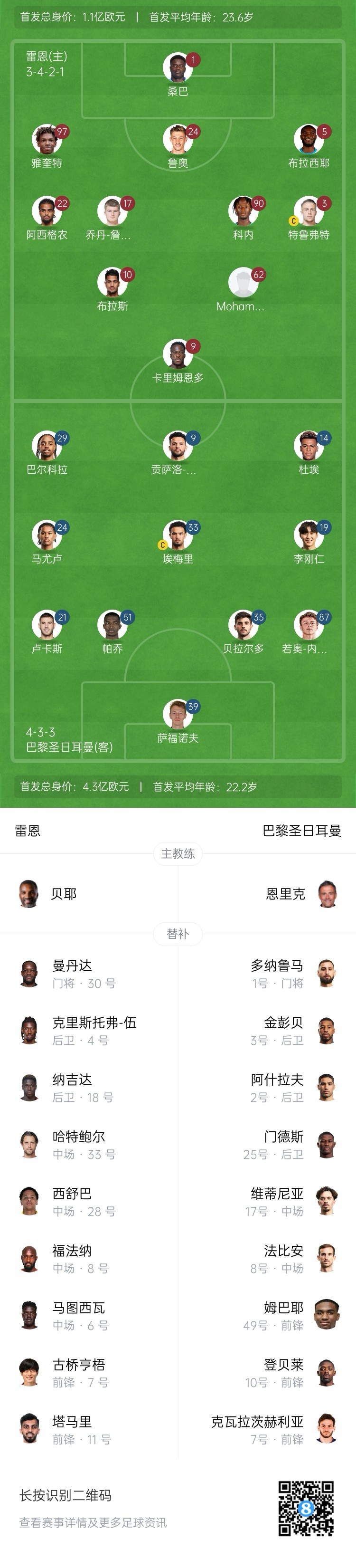 雷恩首發(fā):1-桑巴、97-雅奎特、24-魯奧、5-布拉西耶、22-阿西格農、17-喬丹-詹姆斯、90-科內、3-特魯弗特、10-布拉斯、62-梅特、9-卡里姆恩多