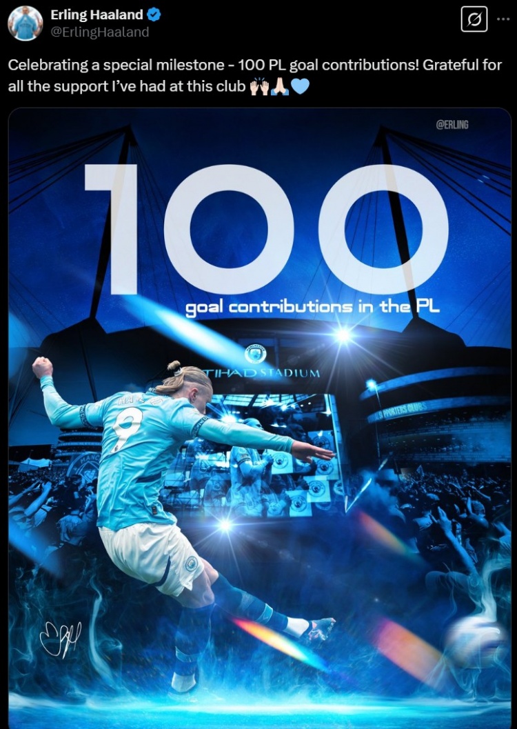 這是哈蘭德生涯在英超直接參與的第100粒進(jìn)球(84球16助攻),他在個人社媒也曬出紀(jì)念海報,配文寫道:“紀(jì)念達(dá)成了一項(xiàng)特殊的里程碑—第100次參與英超進(jìn)球。感謝我來到球隊以來一直支持我的人們。”