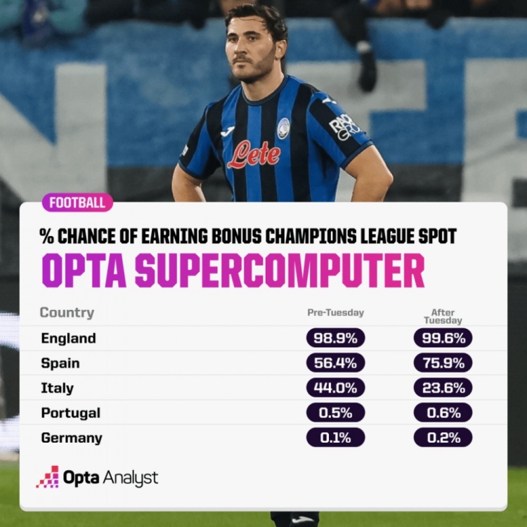 Opta下賽季歐冠額外席位概率:英超99.6%,西甲75.9%,意甲23.6%?