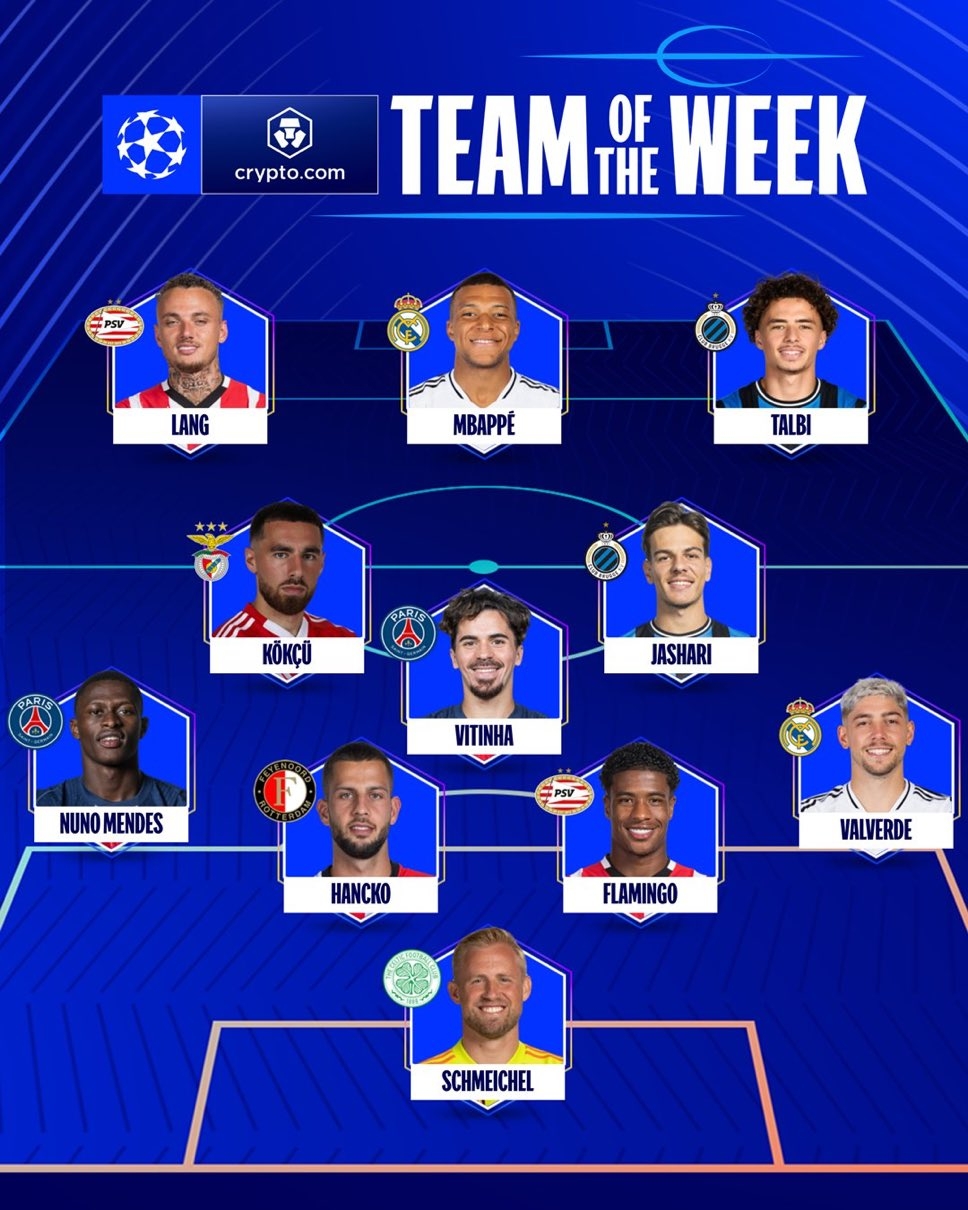 2月21日訊 本周歐冠比賽結(jié)束,歐足聯(lián)官方宣布了本周歐冠最佳陣容,姆巴佩領(lǐng)銜。