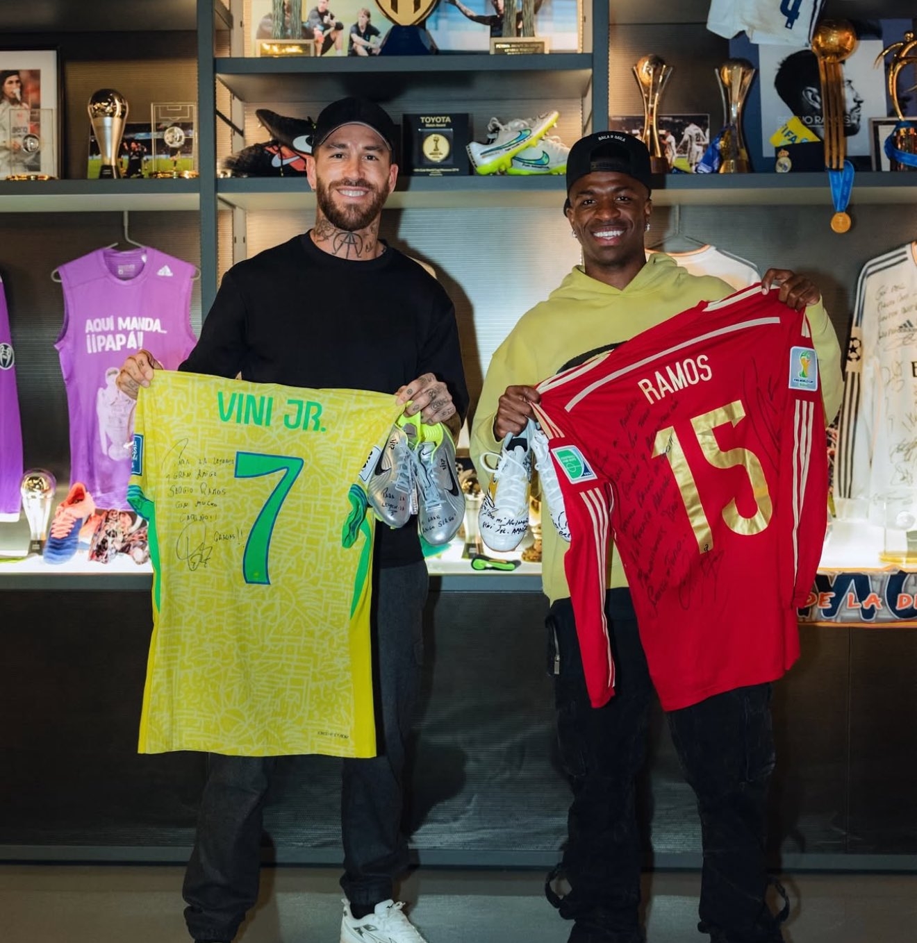 皇馬邊鋒維尼修斯也在近日拜訪了前輩拉莫斯的家,兩人交換國(guó)家隊(duì)球衣并合影留念。