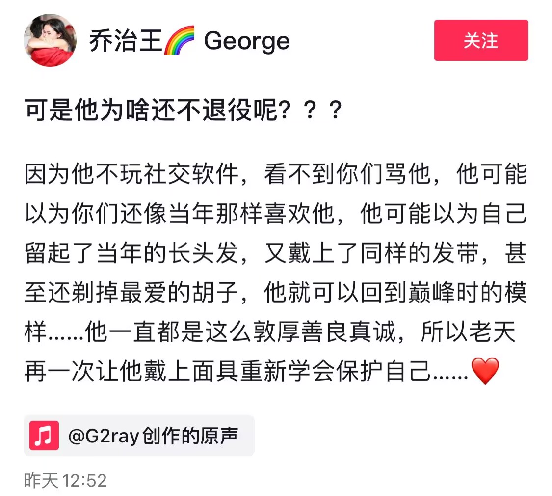 因?yàn)樗煌嫔缃卉浖?,看不到你們罵他,他可能以為你們還像當(dāng)年那樣喜歡他,他可能以為自己留起了當(dāng)年的長頭發(fā),又戴上了同樣的發(fā)帶,甚至還剃掉最愛的胡子,他就可以回到巔峰時(shí)的模樣…… 他一直都是這么敦厚善良真誠,所以老天再一次讓他戴上面具重新學(xué)會(huì)保護(hù)自己……?