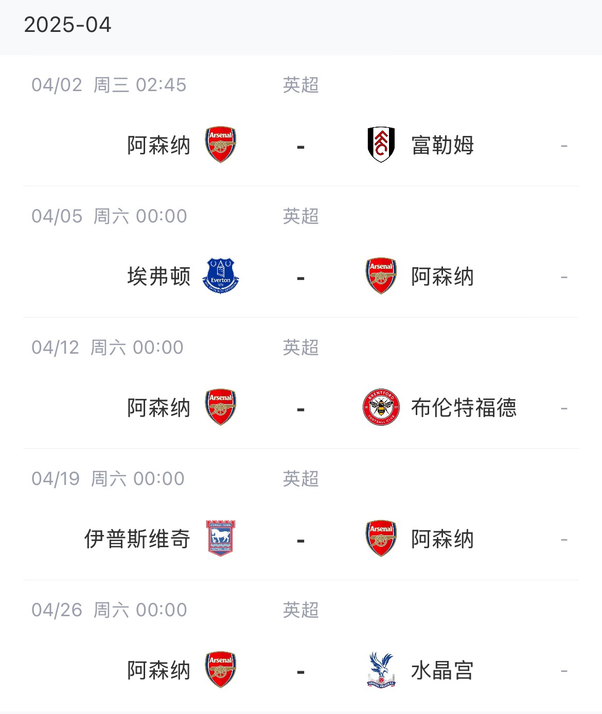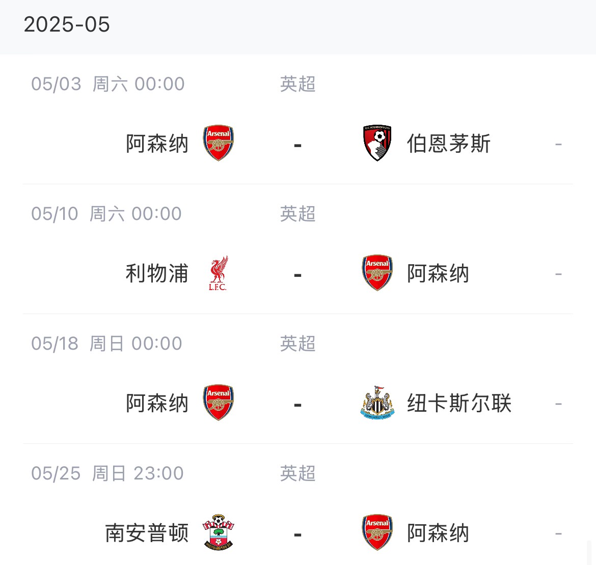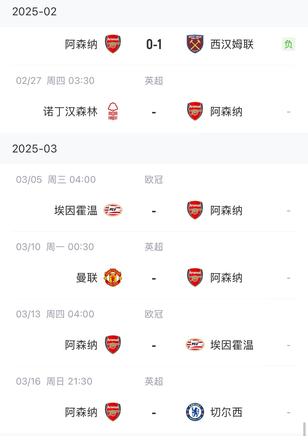 阿森納還剩12輪英超,接下來(lái)他們將先后對(duì)陣森林、曼聯(lián)和切爾西,5月中旬需連戰(zhàn)利物浦和紐卡。歐冠1/8決賽阿森納將對(duì)陣埃因霍溫,足總杯和聯(lián)賽杯他們均已出局。