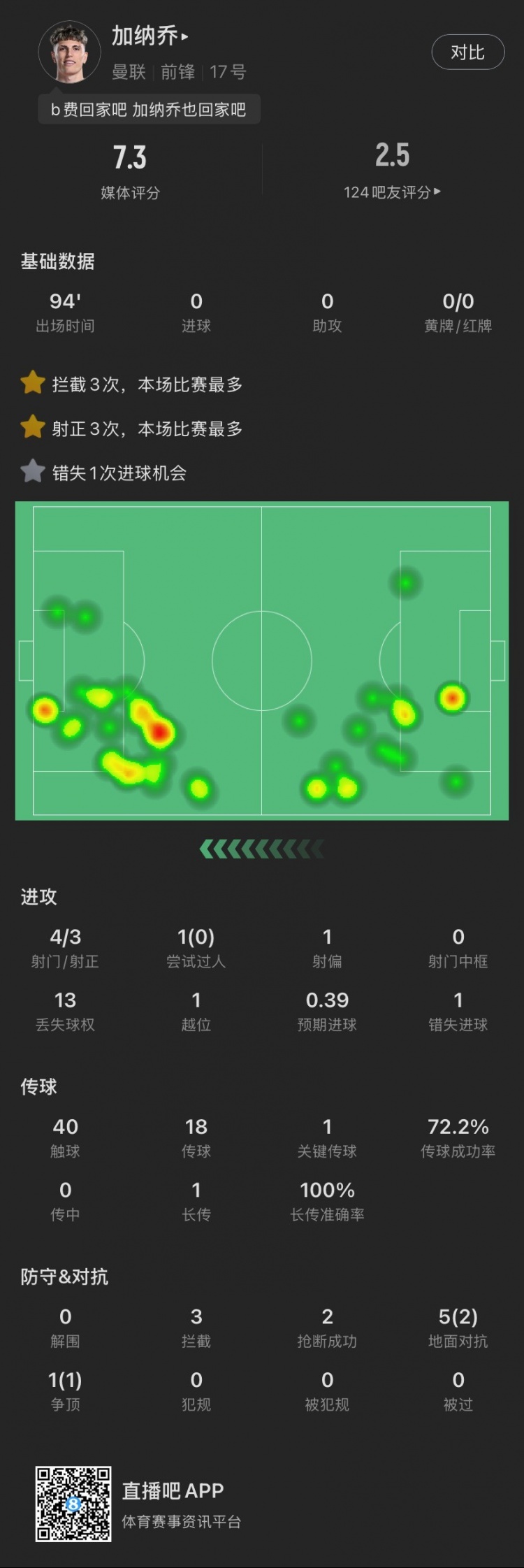 2月17日訊 在剛剛結(jié)束的英超本輪焦點(diǎn)戰(zhàn)中,曼聯(lián)0-1不敵熱刺。本場(chǎng)比賽,加納喬打滿全場(chǎng)但表現(xiàn)欠佳,獲評(píng)7.3分。