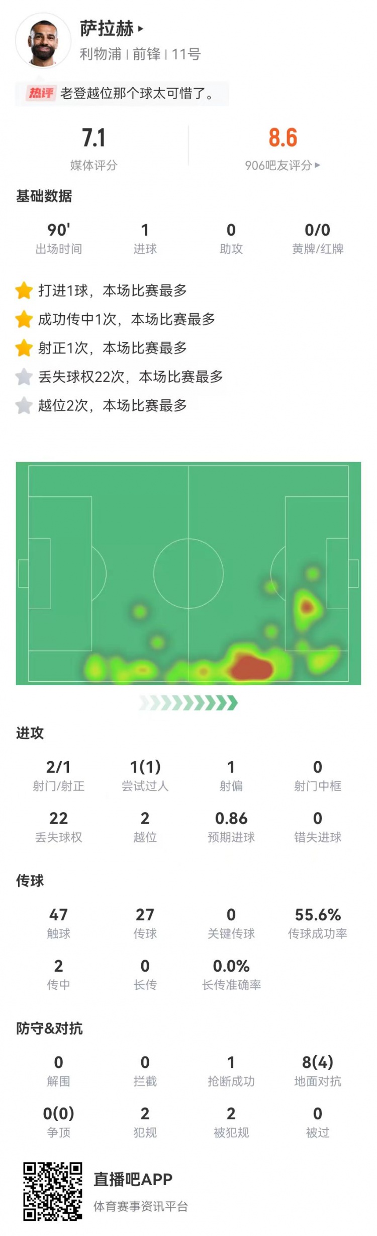 薩拉赫本場1球+8對(duì)抗4成功 2犯規(guī)2造犯規(guī)2越位 獲評(píng)7.1分?