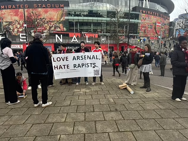 2月25日訊 《每日郵報(bào)》報(bào)道,在阿森納和西漢姆的比賽前,有阿森納球迷在球場外抗議強(qiáng)奸犯和性暴力。