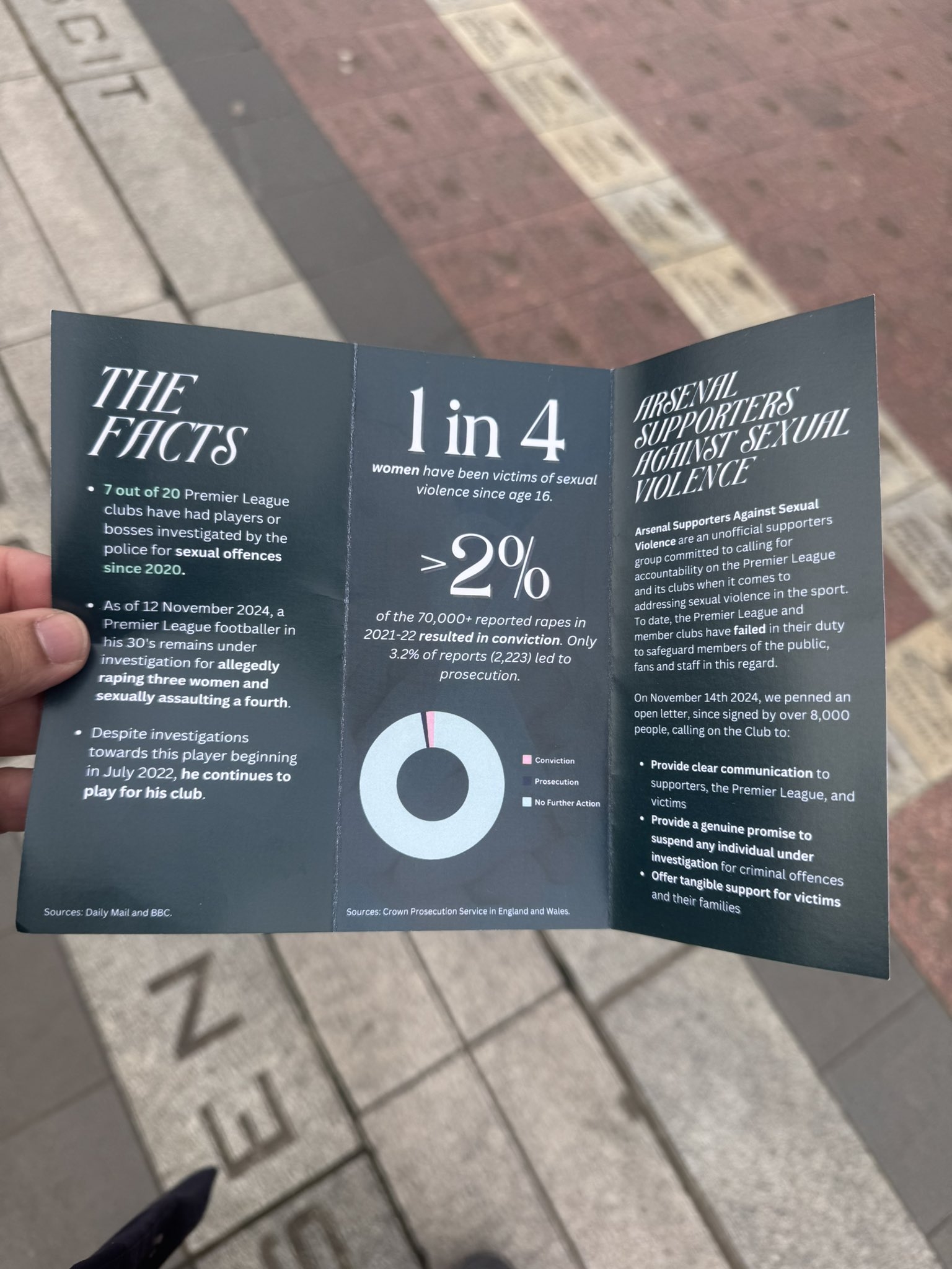 其中一頁寫道:“阿森納球迷反對(duì)性暴力組織是一個(gè)非官方的支持者團(tuán)體,致力于呼吁英超聯(lián)賽及其俱樂部在解決體育運(yùn)動(dòng)中的性暴力問題時(shí)承擔(dān)責(zé)任。迄今為止,英超聯(lián)賽及其成員俱樂部在這方面未能盡到保護(hù)公眾、球迷和工作人員的責(zé)任?!?/p>