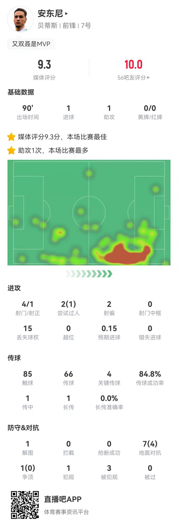 圓神閃耀!安東尼本場(chǎng)1球1助攻1造點(diǎn) 4關(guān)鍵傳球3造犯規(guī) 9.3分最高?